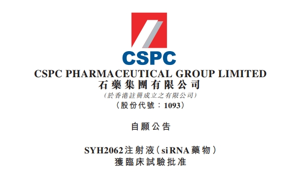 12月23日,石藥集團(tuán)宣布,本集團(tuán)自主研發(fā)的化學(xué)1類新藥SYH2062注射液(雙鏈小干擾RNA(siRNA)藥物)(下稱:該產(chǎn)品)已獲得中華人民共和國(guó)國(guó)家藥品監(jiān)督管理局批準(zhǔn),可以在中國(guó)開(kāi)展臨床試驗(yàn)。