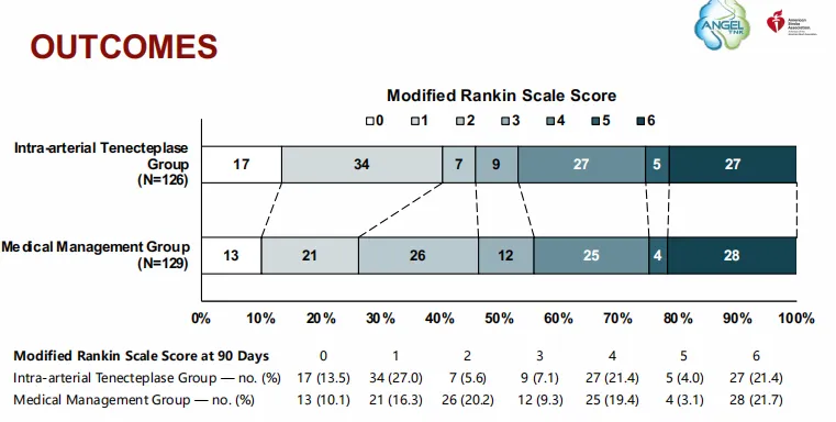 ANGEL-TNK研究最終證實(shí):①對(duì)于中國(guó)發(fā)病4.5-24h的急性前循環(huán)大血管閉塞性缺血性卒中患者,在血管內(nèi)治療獲得血管再通后(eTICI分級(jí) 2b50~3級(jí)),采用0.125 mg/kg的替奈普酶動(dòng)脈溶栓,與常規(guī)藥物治療相比,可以顯著改善患者的神經(jīng)功能結(jié)局。②與常規(guī)藥物治療相比,替奈普酶動(dòng)脈溶栓是安全的,不增加癥狀性顱內(nèi)出血的風(fēng)險(xiǎn)。