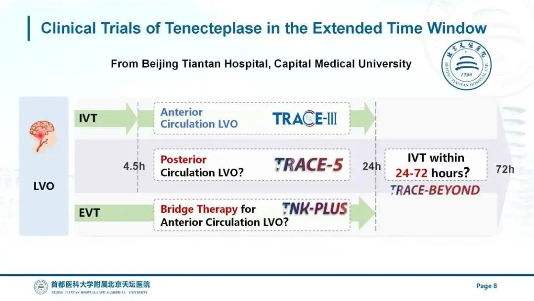 此外,首都醫(yī)科大學(xué)附屬北京天壇醫(yī)院王擁軍教授團(tuán)隊(duì)正在同步開(kāi)展多項(xiàng)隨機(jī)對(duì)照試驗(yàn),持續(xù)深耕拓展靜脈溶栓治療時(shí)間窗研究。其中TRACE-BEYOND旨在研究替奈普酶超晚時(shí)間窗(發(fā)病24-72h)前循環(huán)大動(dòng)脈閉塞的靜脈溶栓治療。TRACE-5旨在研究超時(shí)間窗(發(fā)病4.5-24h)后循環(huán)大動(dòng)脈閉塞的靜脈溶栓治療。TNK-PLUS旨在研究超時(shí)間窗(發(fā)病4.5-24h)前循環(huán)大動(dòng)脈閉塞的橋接治療。首都醫(yī)科大學(xué)附屬北京天壇醫(yī)院熊云云教授在國(guó)際卒中大會(huì)現(xiàn)場(chǎng)介紹了每項(xiàng)試驗(yàn)的研究目的、研究設(shè)計(jì)及當(dāng)前的研究進(jìn)展。
