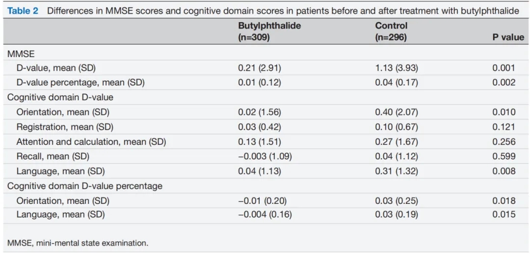 1)丁苯酞能減輕缺血性卒中患者M(jìn)MSE評分的下降程度(D值及D值百分比);