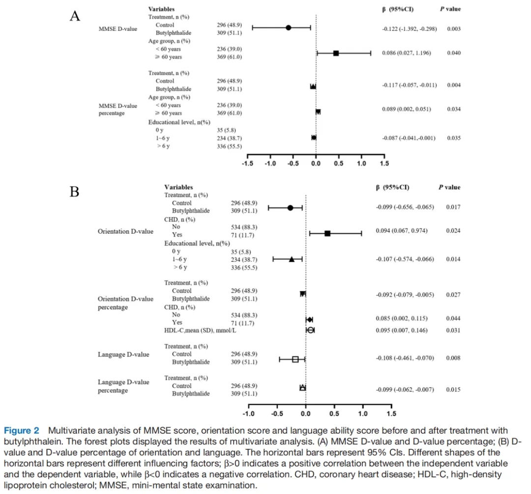 3)多因素分析表明,丁苯酞治療與MMSE評分的改變、定向力和語言能力的改變均呈獨(dú)立負(fù)相關(guān);年齡≥60歲和較低的教育水平被認(rèn)為是認(rèn)知能力下降的危險因素。如下圖: