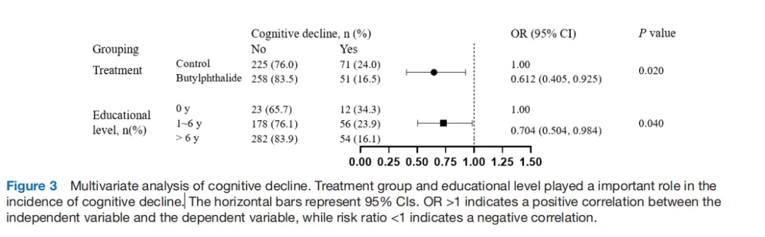 12個月時,丁苯酞組有51名患者(16.5%)出現(xiàn)認(rèn)知功能下降,對照組有71名患者(24.0%)出現(xiàn)認(rèn)知功能下降,兩組差異有統(tǒng)計學(xué)意義(P=0.022);多因素分析表明,丁苯酞治療與較低的認(rèn)知功能下降風(fēng)險相關(guān)(OR=0.612; P= 0.020),與對照組比較,丁苯酞組一年后發(fā)生認(rèn)知障礙的風(fēng)險降低了38.8%。如下圖:
