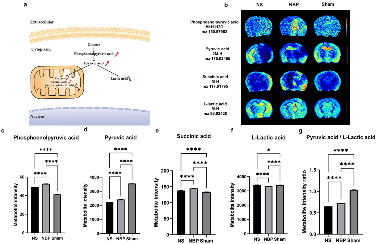 大腦極易發(fā)生局部缺血,盡管只占其體重的2%,但消耗了人體約20-25%的氧氣和葡萄糖。不間斷的能量供應對腦組織功能至關重要,外源性(如氧氣和葡萄糖)或內源性(如線粒體功能障礙)因素造成的中斷均可能導致不可逆的損傷。KEGG通路富集分析表明,NBP上調了與丙酮酸代謝和檸檬酸循環(huán)相關的通路,這兩者都是能量供應所必需的(圖3i)。圖4a顯示了詳細的能量供應機制的示意圖。NBP組能量相關代謝物的水平,包括磷酸烯醇丙酮酸、丙酮酸和琥珀酸,顯著上調,而乳酸水平顯著下調(圖4b-f)。這些發(fā)現表明NBP組的線粒體有氧呼吸能量供應系統顯著增強。此外,丙酮酸與L-乳酸比例的增加(圖4g)同樣表明NBP組的線粒體功能增強,綜上結果顯示線粒體是NBP的潛在靶點。