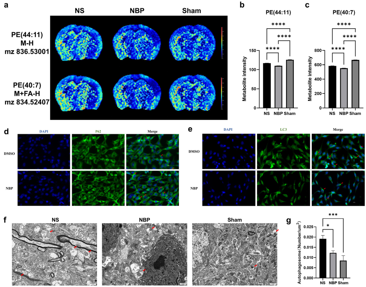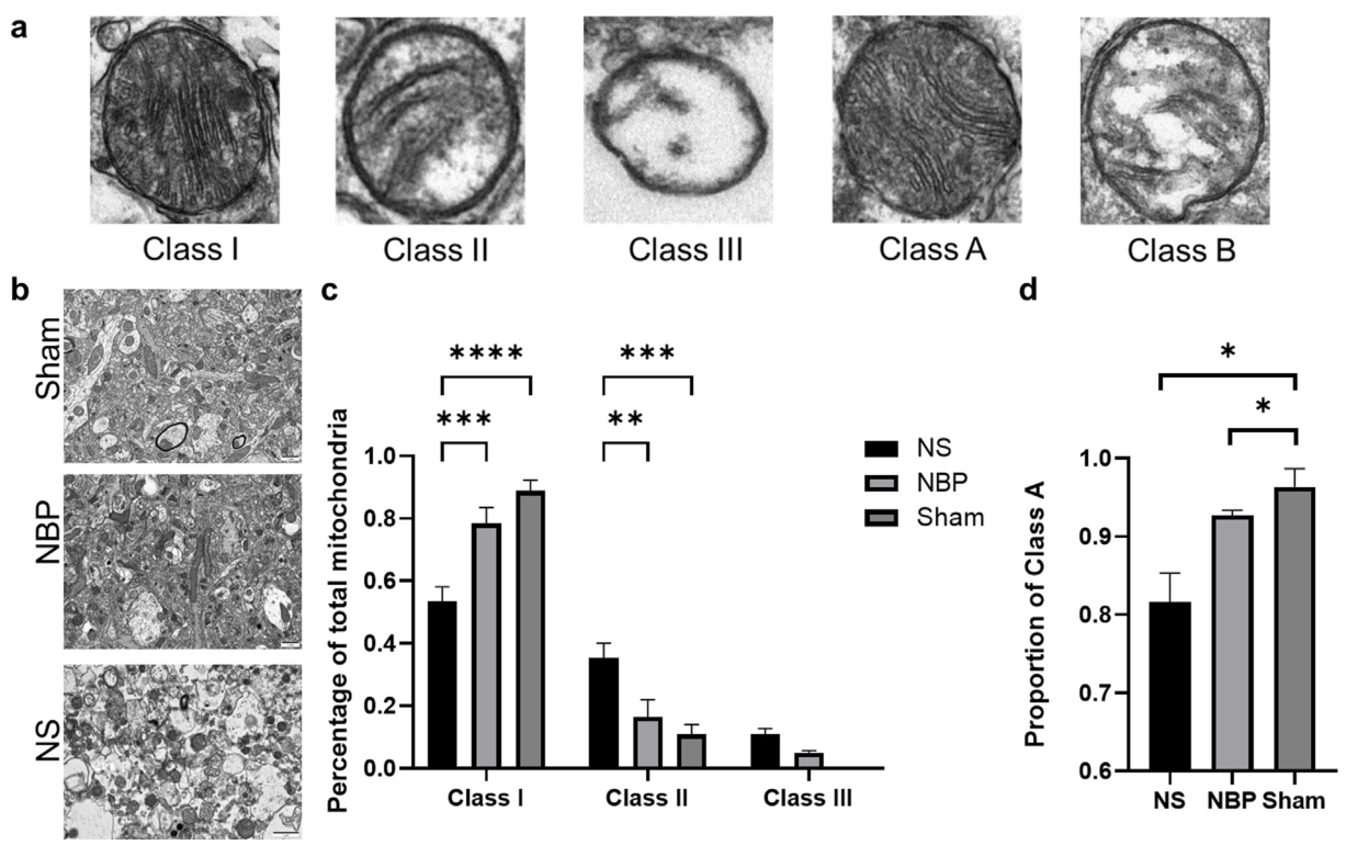 空間代謝組學的結果表明線粒體可能是NBP的靶點。為了進一步驗證這一假設,研究人員分析了線粒體的形態(tài)變化,包括線粒體嵴數、基質密度和腫脹。從形態(tài)學的角度來看,每個線粒體的嵴數量增加和基質密度增加表明線粒體功能狀態(tài)得到改善。線粒體嵴、基質密度和腫脹的分類如圖5a所示。分析結果顯示,NBP對于線粒體嵴、基質密度和腫脹表現出不同程度的改善作用(圖5b, c和d)。