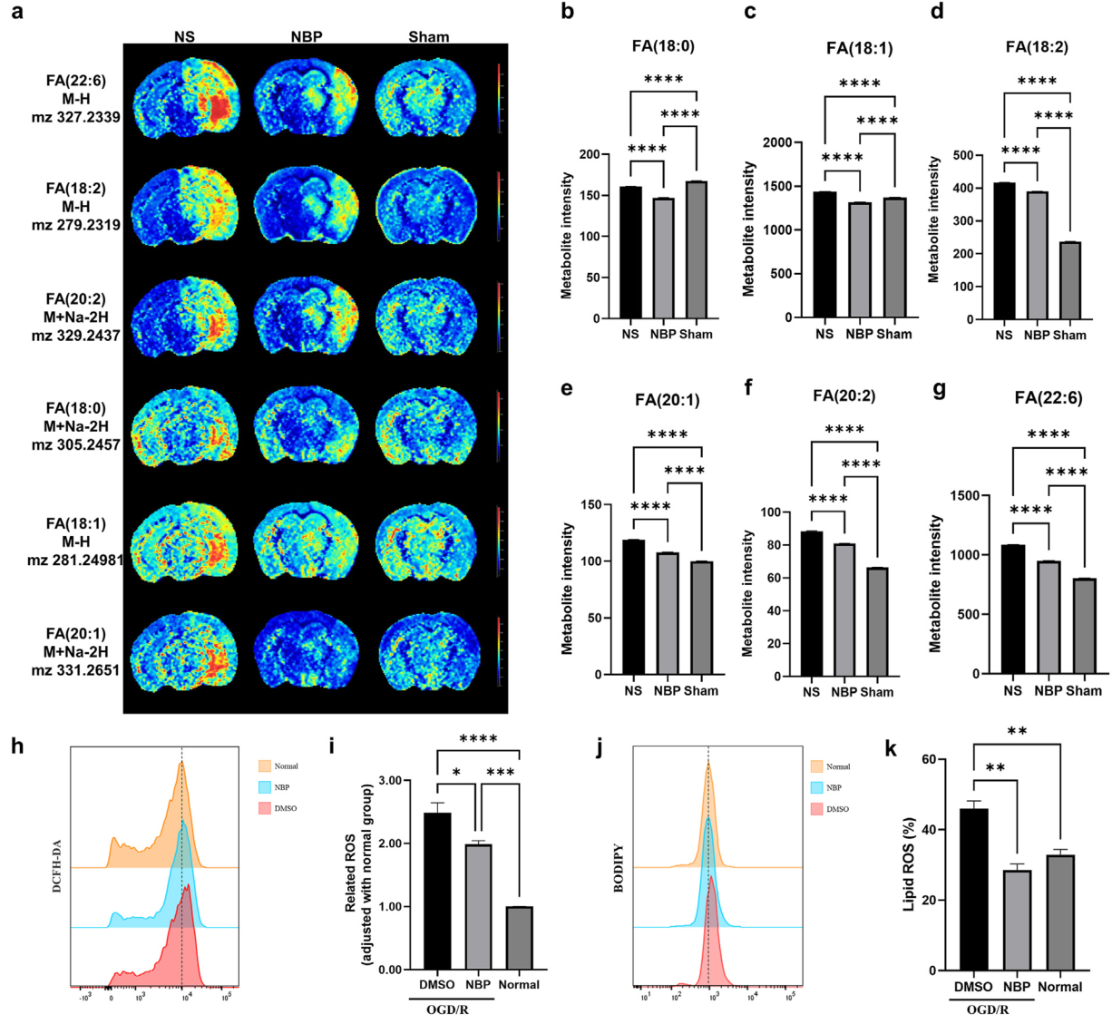 脂質代謝在維持正常細胞功能方面至關重要,有研究表明,多不飽和脂肪酸(PUFA)參與調節(jié)鐵死亡,鐵死亡是一種參與缺血再灌注損傷的細胞死亡方式。研究結果顯示,NBP可以抑制不飽和脂肪酸的生物合成途徑(圖3j),通過定量分析也證實了NBP參與到PUFA的生物合成途徑中(圖7a-g),表明鐵死亡可能是NBP改善神經功能的潛在機制之一。此外,ROS作為鐵死亡的重要指標,在細胞模型中,NBP也表現出降低ROS(圖7h和i)和脂質ROS(圖7j和k)的作用。綜上結果表明,NBP可能通過抑制不飽和脂肪酸的生物合成來抑制鐵死亡,從而發(fā)揮神經保護作用。