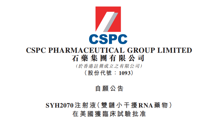 10月9日,石藥集團(tuán)(1093.HK)宣布,本集團(tuán)自主研發(fā)的化學(xué)1類新藥SYH2070注射液(雙鏈小干擾RNA(siRNA)藥物)(下稱:該產(chǎn)品)已獲得美國(guó)食品藥品監(jiān)督管理局(FDA)批準(zhǔn),可在美國(guó)開(kāi)展臨床試驗(yàn)。該產(chǎn)品亦于2025年9月獲得中華人民共和國(guó)國(guó)家藥品監(jiān)督管理局批準(zhǔn)在中國(guó)開(kāi)展臨床試驗(yàn)。