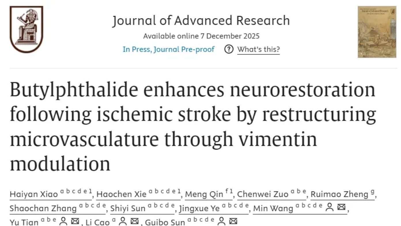 近日,中國(guó)醫(yī)學(xué)科學(xué)院北京協(xié)和醫(yī)學(xué)院藥用植物研究所孫桂波教授團(tuán)隊(duì)研究成果《Butylphthalide Enhances Neurorestoration following Ischemic Stroke by Restructuring Microvasculature through?Vimentin Modulation》發(fā)表在《Journal of Advanced Research》雜志(影響因子13.0分),首次明確丁苯酞(NBP)通過(guò)靶向Vimentin(VIM)重塑微血管網(wǎng)絡(luò),進(jìn)而促進(jìn)缺血性腦卒中后的神經(jīng)修復(fù),為NBP的臨床用藥提供了堅(jiān)實(shí)的理論基礎(chǔ)。