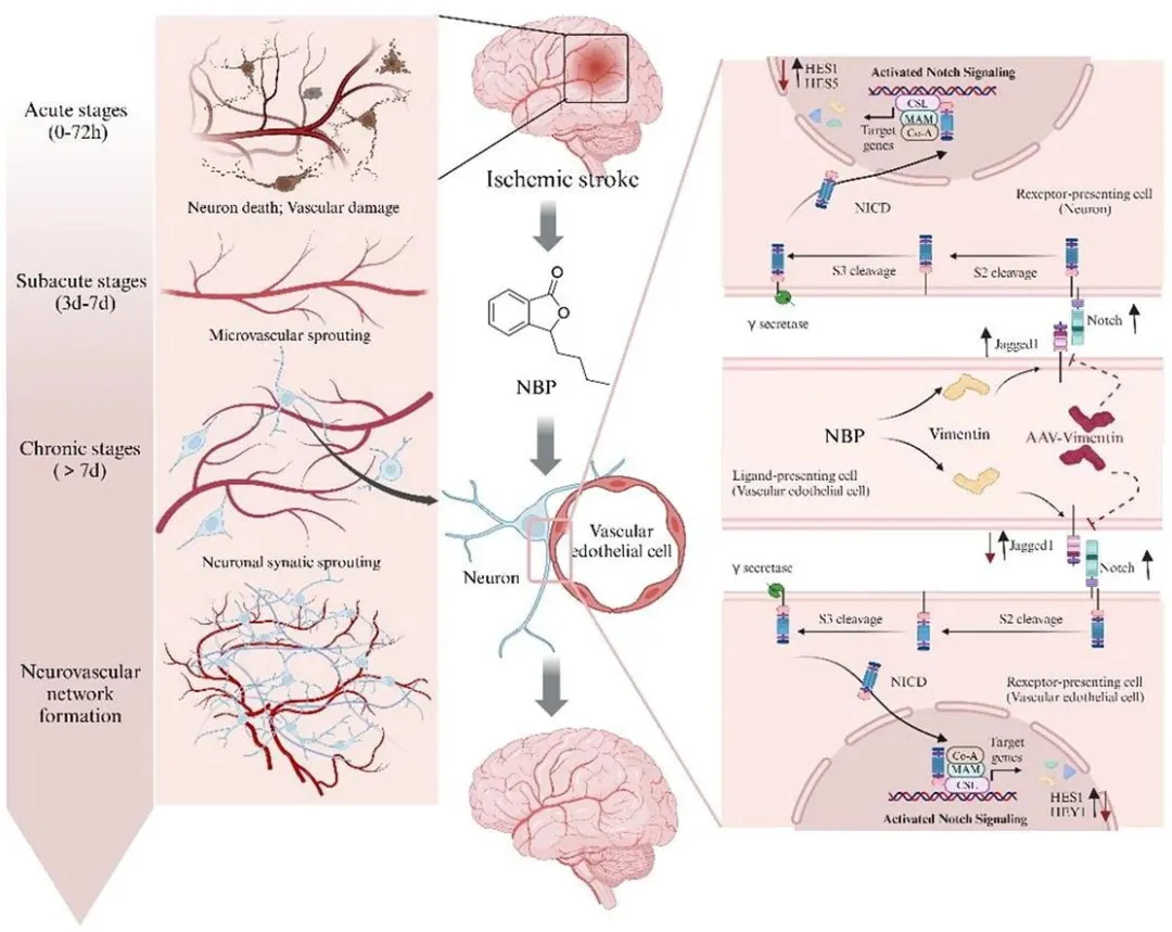 研究結(jié)果表明, NBP通過(guò)重塑微血管系統(tǒng)以促進(jìn)神經(jīng)修復(fù),有效治療缺血性卒中。VIM被確定為NBP 的新靶點(diǎn),這為探索VIM在神經(jīng)血管耦合中的作用奠定了基礎(chǔ)。進(jìn)一步機(jī)制研究顯示,NBP通過(guò)靶向VIM調(diào)控Notch信號(hào)通路,進(jìn)而促進(jìn)缺血性卒中后的血管新生與神經(jīng)修復(fù)。