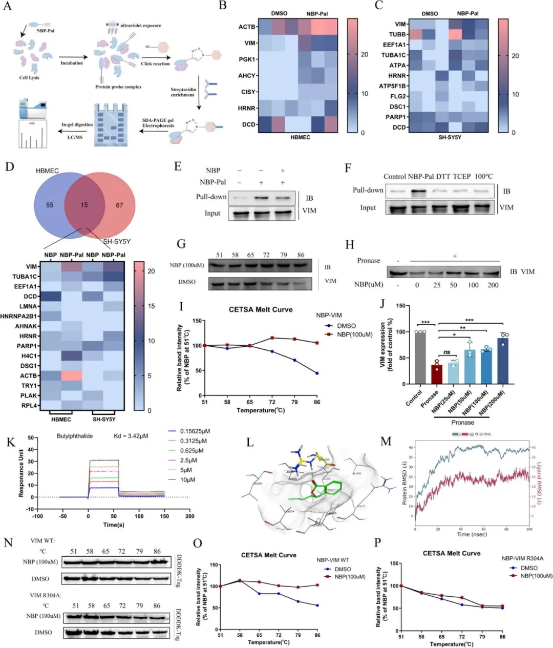 結(jié)果二:為了明確其作用機(jī)制,研究通過(guò)合成NBP光親和探針,在內(nèi)皮細(xì)胞和神經(jīng)元中成功“垂釣”出了靶蛋白VIM。隨后多個(gè)生化實(shí)驗(yàn)表明NBP與VIM存在特異性且穩(wěn)定的結(jié)合。
