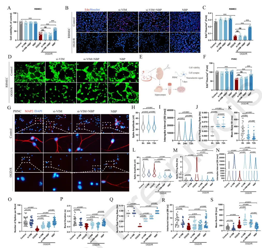 結(jié)果三:建立OGD/R誘導(dǎo)的細(xì)胞損傷模型,通過(guò)敲低技術(shù)探究VIM的功能,結(jié)果表明VIM敲低顯著抑制了NBP的保護(hù)作用,NBP需要依賴(lài)VIM來(lái)促進(jìn)血管新生。