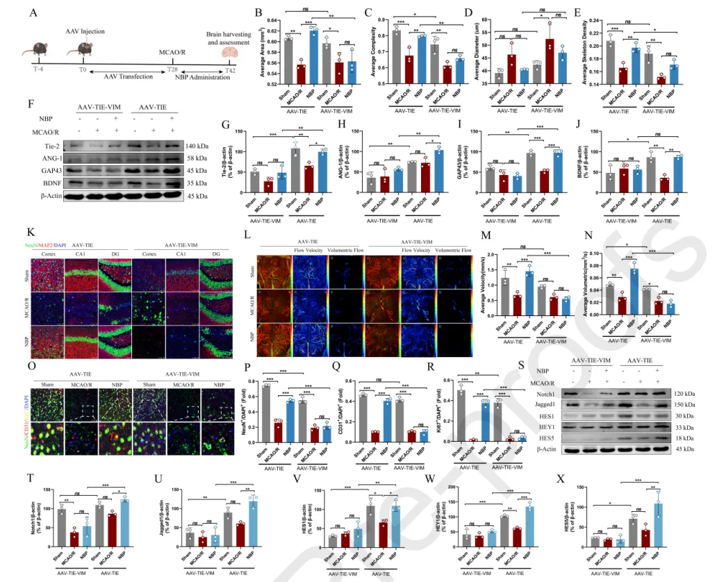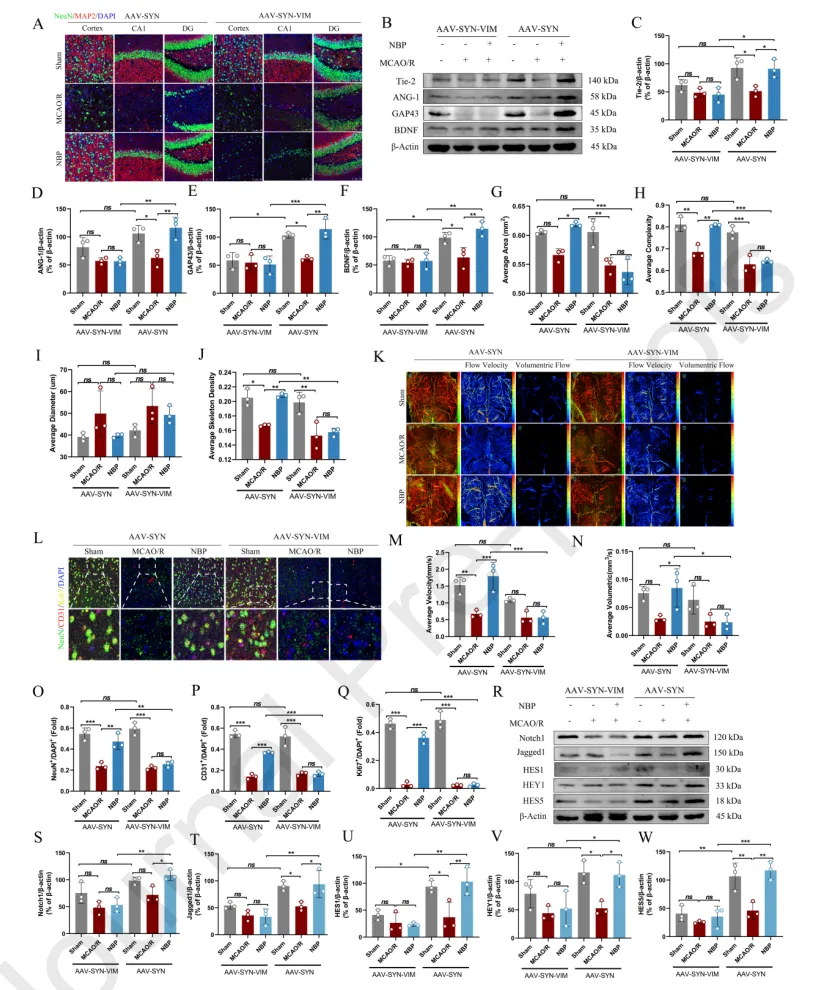 結(jié)果五:構(gòu)建了特異性敲低神經(jīng)元中的VIM的小鼠模型,研究發(fā)現(xiàn)特異性敲低神經(jīng)元中的VIM未顯著影響新生血管形成,但對(duì)神經(jīng)修復(fù)產(chǎn)生影響。研究顯示NBP通過(guò)靶向VIM,進(jìn)而激活了在血管新生和神經(jīng)發(fā)生中都起關(guān)鍵作用的Notch信號(hào)通路,從而協(xié)調(diào)促進(jìn)卒中后的微血管重建與神經(jīng)修復(fù)。