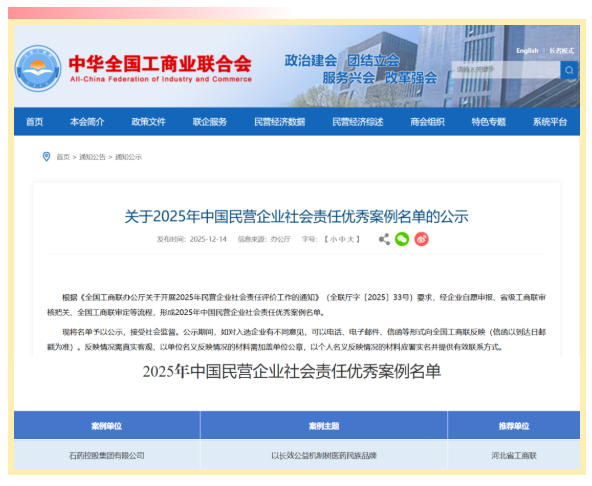 石藥集團榮膺“2025年中國民營企業(yè)社會責任優(yōu)秀案例”稱號