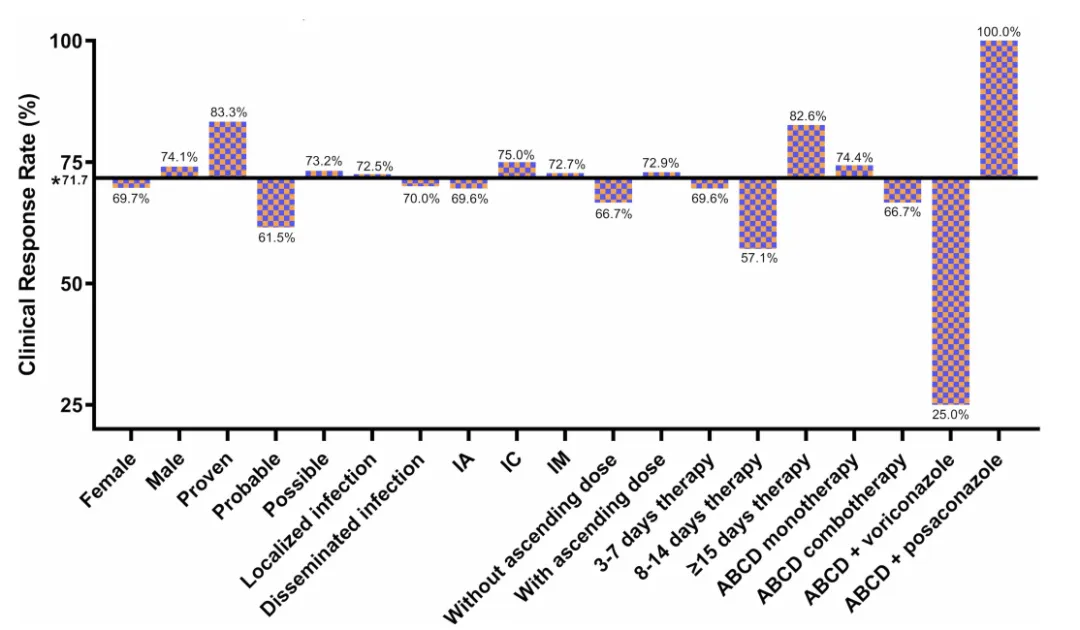 在納入的60例患者中,ABCD的臨床應(yīng)答率為71.7%(43/60;95% 置信區(qū)間[CI]:59.2%~81.5%)。ABCD單藥治療和聯(lián)合治療的臨床應(yīng)答率分別為74.4%(29/39)和66.7%(14/21),差異無統(tǒng)計學(xué)意義(P=0.528)。各亞組患者的臨床應(yīng)答率見圖1,亞組分析顯示,性別、基礎(chǔ)疾病、感染部位及既往抗真菌治療均未對療效產(chǎn)生顯著影響。肝毒性、腎毒性和輸注相關(guān)反應(yīng)的發(fā)生率分別為13.3%、23.3%和1.7%。