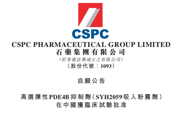 石藥集團(tuán)高選擇性PDE4B抑制劑(SYH2059吸入粉霧劑)在中國獲批臨床