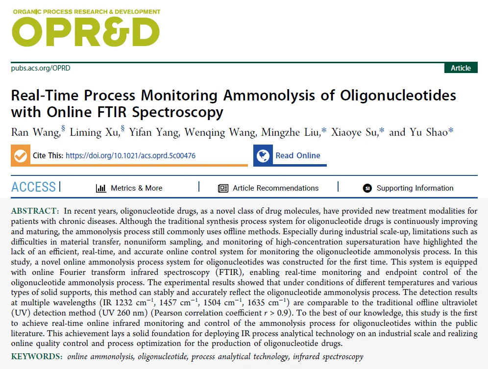 近日,由石藥集團研發(fā)的基于紅外光譜技術(shù)用于寡核苷酸在線氨解監(jiān)測的研究成果以研究論文(Article)形式發(fā)表在國際著名化學(xué)期刊ACS旗下Org. Process Res. Dev.雜志,標(biāo)題為《Real-Time Process Monitoring Ammonolysis of Oligonucleotides with Online FTIR Spectroscopy》。