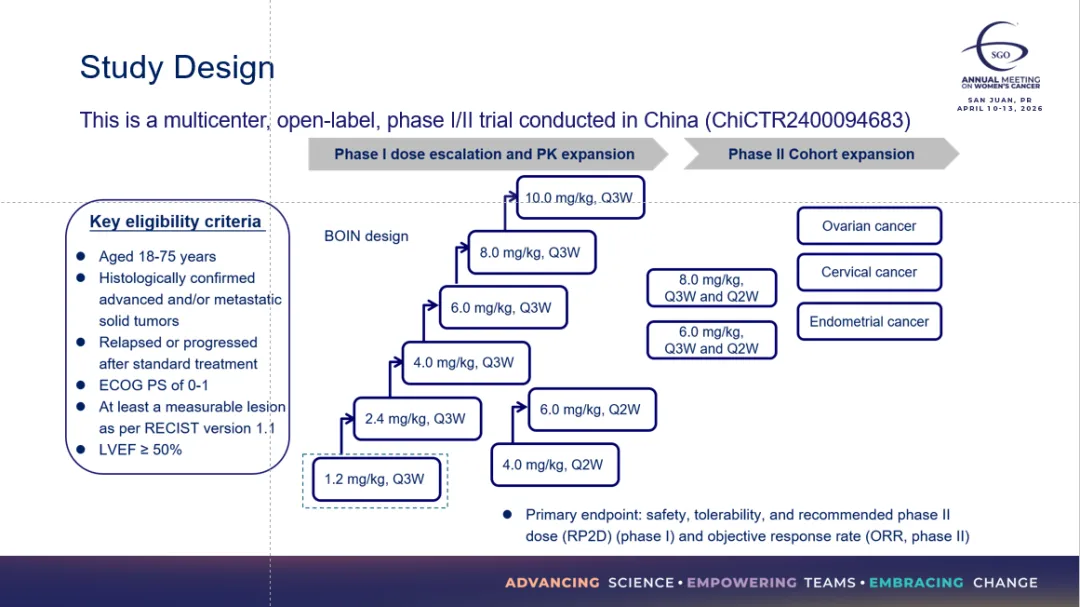 該I/II期研究在中國開展(ChiCTR2400094683),探索不同的劑量隊列,包括1.2 mg/kg、2.4 mg/kg、4 mg/kg、6 mg/kg、8 mg/kg和10 mg/kg(每三周一次,Q3W)以及4 mg/kg、6 mg/kg(每兩周一次,Q2W)方案,旨在評估SYS6043在包括婦科腫瘤在內(nèi)的晚期或轉移性實體瘤患者中的安全性、耐受性、藥代動力學及初步抗腫瘤活性。