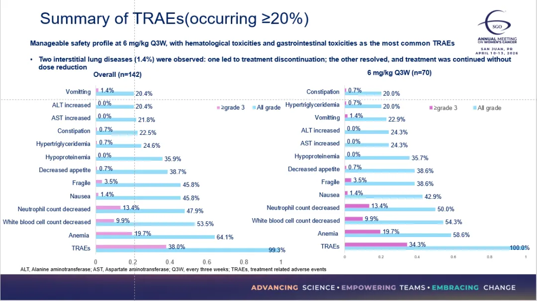 安全性結果顯示,在總體142例患者中,任何級別的治療相關不良事件(TRAEs)發(fā)生率為99.3%,≥3級TRAEs發(fā)生率為38.0%。在6 mg/kg Q3W隊列(n=70)中,任何級別TRAEs發(fā)生率為100%,≥3級TRAEs發(fā)生率為34.3%。因TRAEs導致的劑量減少和治療終止發(fā)生率較低,分別為7.0%和0%。治療相關死亡事件發(fā)生1例(0.7%)。SYS6043整體和6 mg/kg Q3W(推薦劑量)表現(xiàn)出可管理的安全性,最常見的治療相關不良事件為血液學毒性和胃腸道毒性,經(jīng)治后易恢復。其中,血液學毒性以貧血、白細胞下降和粒細胞下降為主,胃腸道毒性以疲乏、惡心、食欲下降為主,與同類藥物相比,血液學毒性和胃腸道毒性發(fā)生率低。142例患者中觀察到2例間質(zhì)性肺病發(fā)生,其中1例導致停藥,另1例恢復后繼續(xù)治療。