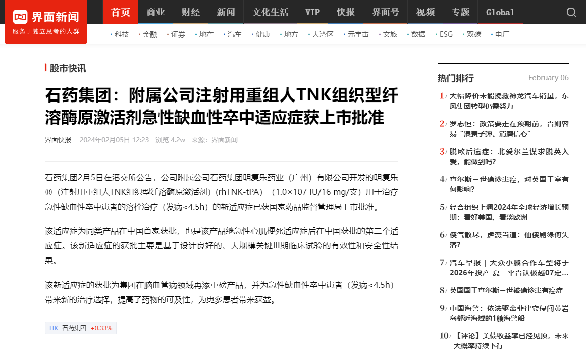 石藥集團明復樂獲批新適應癥,用于急性缺血性卒中患者的溶栓治療