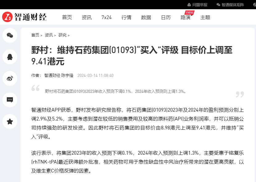 野村:維持石藥集團(tuán)(01093)“買入”評級 目標(biāo)價(jià)上調(diào)至9.41港元